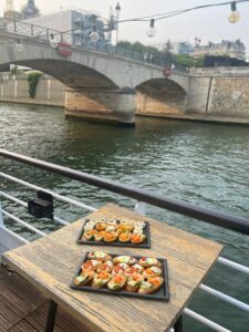 Le choix de la péniche Le Diamant Bleu comme lieu de l’événement n’était pas anodin. Reconnue pour son élégance et son luxe, cette péniche a permis de créer une ambiance à la fois raffinée et détendue. Les invités ont pu profiter de la vue panoramique sur les monuments emblématiques de Paris, tels que la Tour Eiffel, le Louvre et Notre-Dame, illuminés par les lumières scintillantes de la ville.
